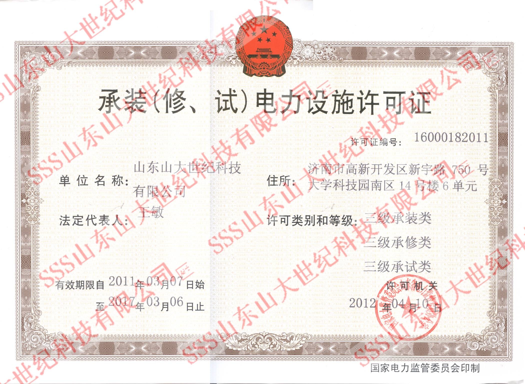4月12日,山東省電監辦資質處正式向我公司頒發了三級承裝(修、試)電力設施許可證。